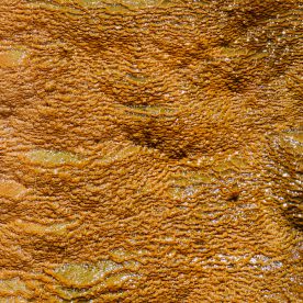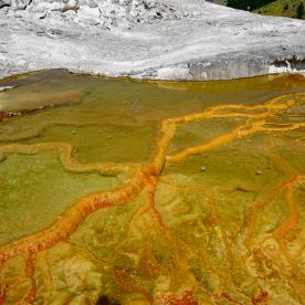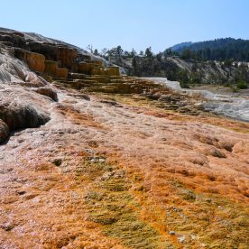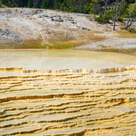 In the Mammoth area, the hot, acidic solution dissolves large quantities of limestone on its way up through the rock layers to the hot springs on the surface. Above ground and exposed to the air, some of the carbon dioxide escapes from the solution. Without it, the dissolved limestone can’t remain in the solution, so it reforms into a solid mineral. This white, chalky mineral is deposited as the travertine that forms the terraces.