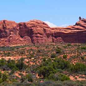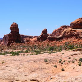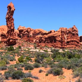 Balanced Rock, one of the most iconic features in the park, stands a staggering 128 feet (39m) tall. While this formation may appear to be an epic balancing act, it’s actually not balanced at all. The slick rock boulder of Entrada Sandstone sits attached to its eroding pedestal of Dewey Bridge mudstone. The exposure of these two rock strata layers are ideal for the formation of arches and balanced rocks.