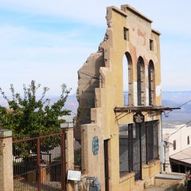 Changing times in the Territory saw pack burros, mule drawn freight wagons, and horses replaced by steam engines, autos and trucks. Fires ravaged the clapboard town again and again. Jerome was always rebuilt. In 1918 underground mining phased out after uncontrollable fires erupted in the 88 miles of tunnels under the town. Open pit mining brought dynamiting. The hills rattled and buildings cracked… the surface began to shift and sections of the business district slid downward. The sliding jail moved 225 ft. and rests across the road from its original site.