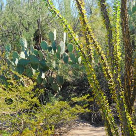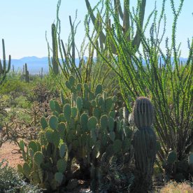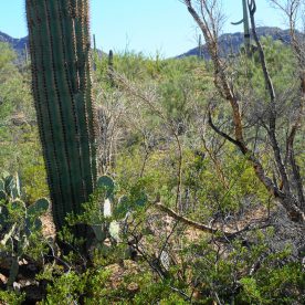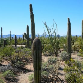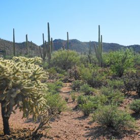 Saguaro National Park is in southern Arizona. Its 2 sections are on either side of the city of Tucson. The park is named for the large saguaro cactus, native to its desert environment. In the western Tucson Mountain District, Signal Hill Trail leads to petroglyphs of the ancient Hohokam people. In the eastern Rincon Mountain District, Cactus Forest Drive is a loop road with striking views of the desert landscape.