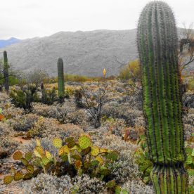The park is named for the large saguaro cactus, native to its desert environment. It is the largest and one of the slowest growing of all cacti, reaching up to 15 meters high and living for several centuries. Plants can weigh up to 8 tons, partly because of the large amount of water the stems can hold – after rainfall the cactus can absorb hundreds of gallons in a short time. The saguaro may be only 6 inches high after 10 years, and the characteristic branched appearance is reached only after around 80 years.