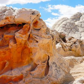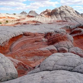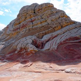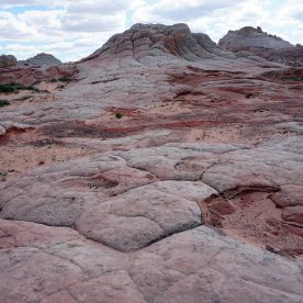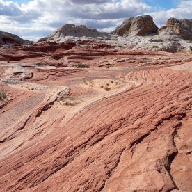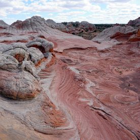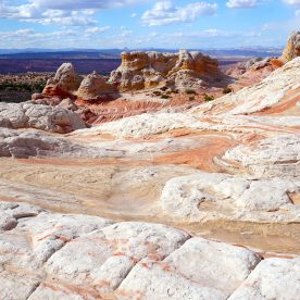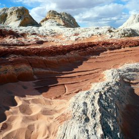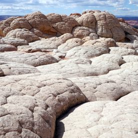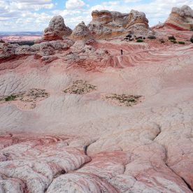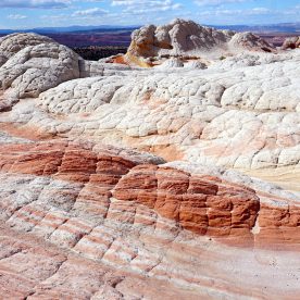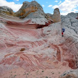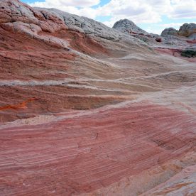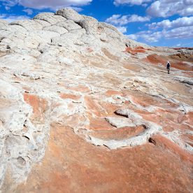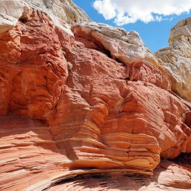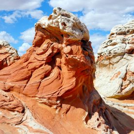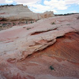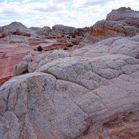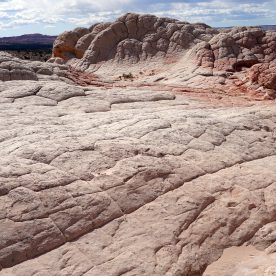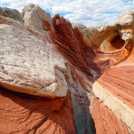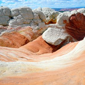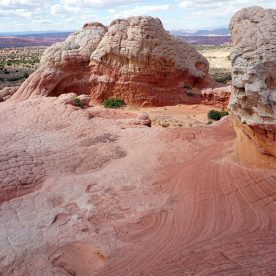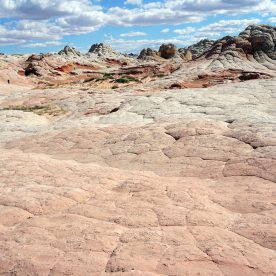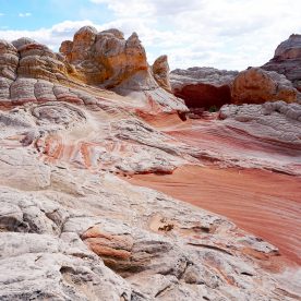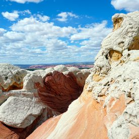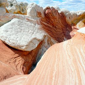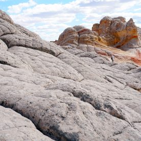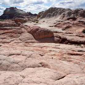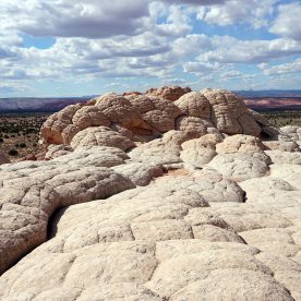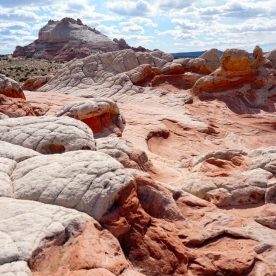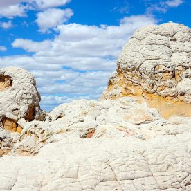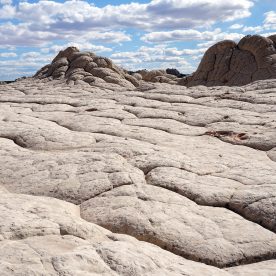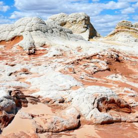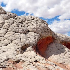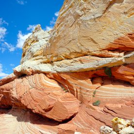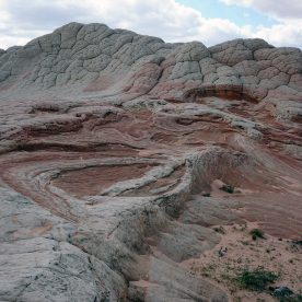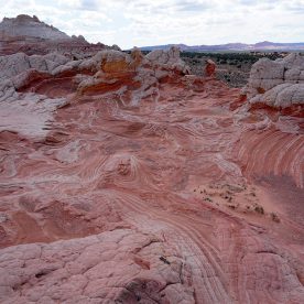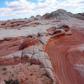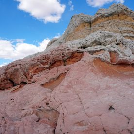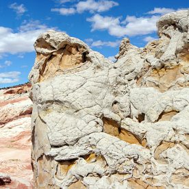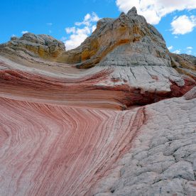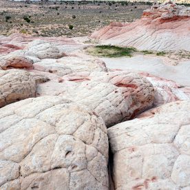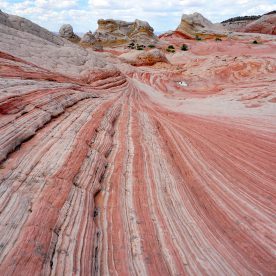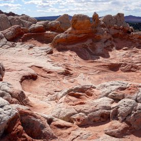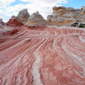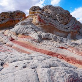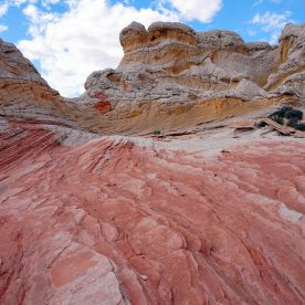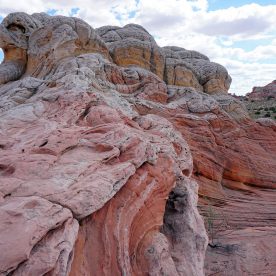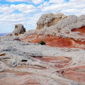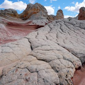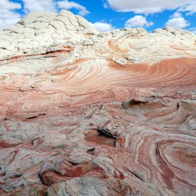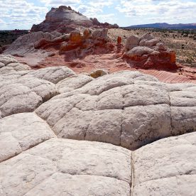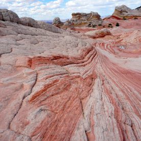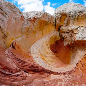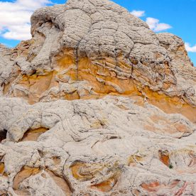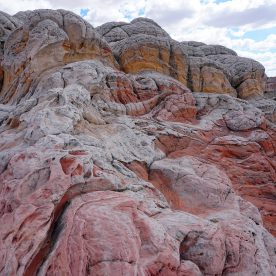 White Pocket is a mix of twists, multi-color striations of white, yellow, red, orange, and pink, pock marks and pools that sometimes fill with water, mushroom like protrusions, strange bulges that look like brains, polygonal fracturing, and wave-like features. The processes that have given yield to these bizarre rock formations stump even expert geologists. Some think that the area was liquefied in an ancient earthquake which distorted the sandstone layers while they were still soft, before they were buried under the oceans for 100 million years and turned to stone under the enormous heat and pressure.