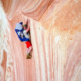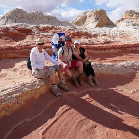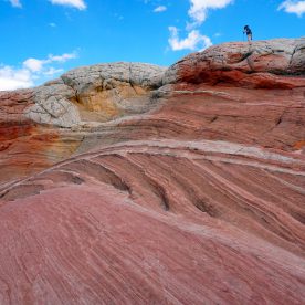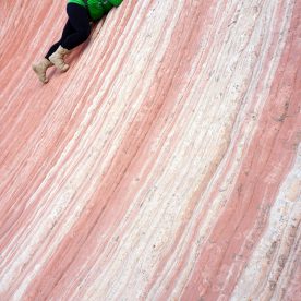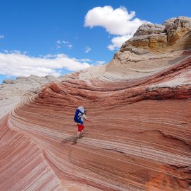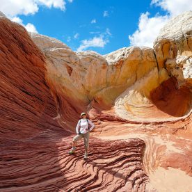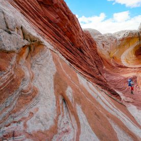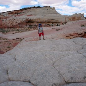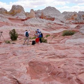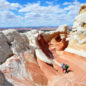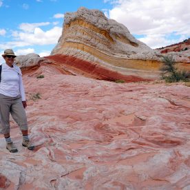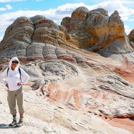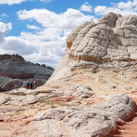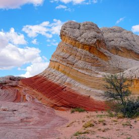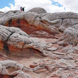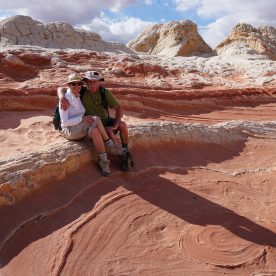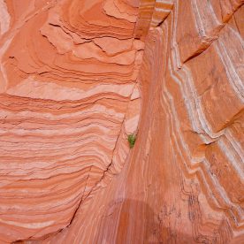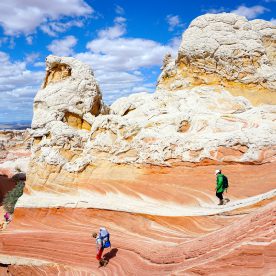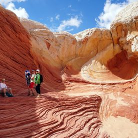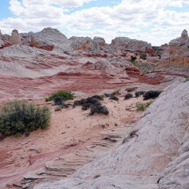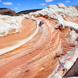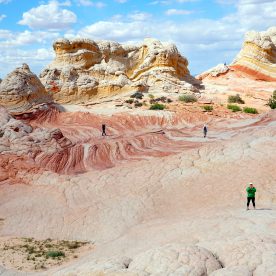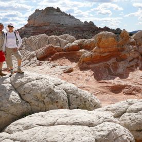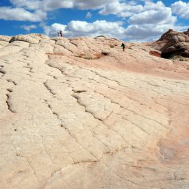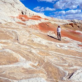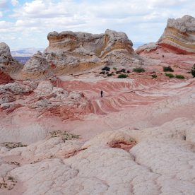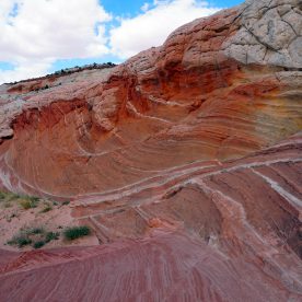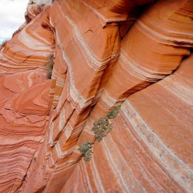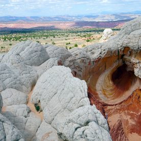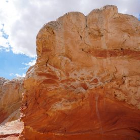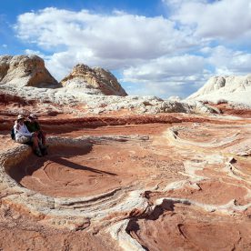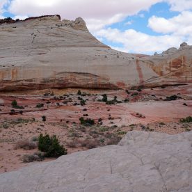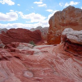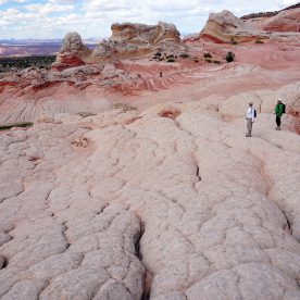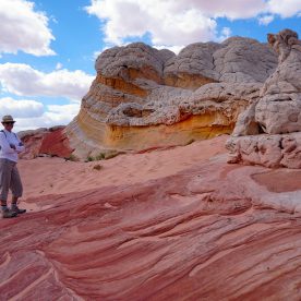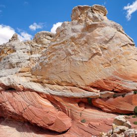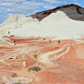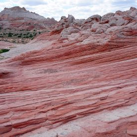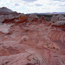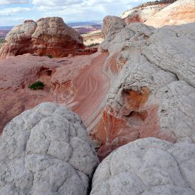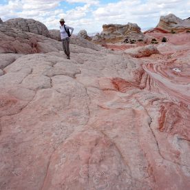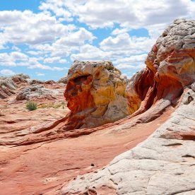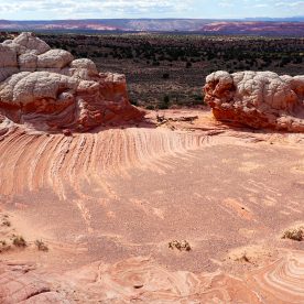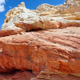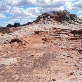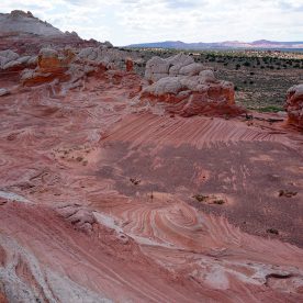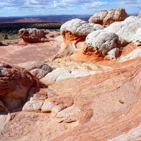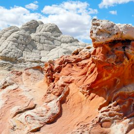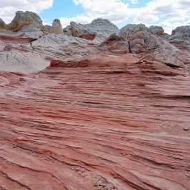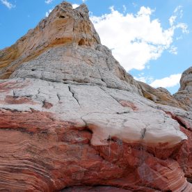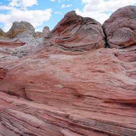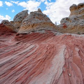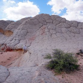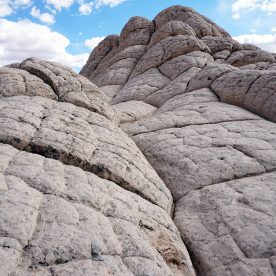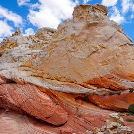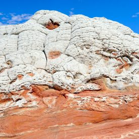 White Pocket is a mix of twists, multi-color striations of white, yellow, red, orange, and pink, pock marks and pools that sometimes fill with water, mushroom like protrusions, strange bulges that look like brains, polygonal fracturing, and wave-like features. The processes that have given yield to these bizarre rock formations stump even expert geologists. Some think that the area was liquefied in an ancient earthquake which distorted the sandstone layers while they were still soft, before they were buried under the oceans for 100 million years and turned to stone under the enormous heat and pressure.