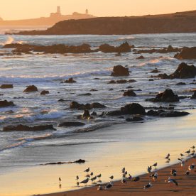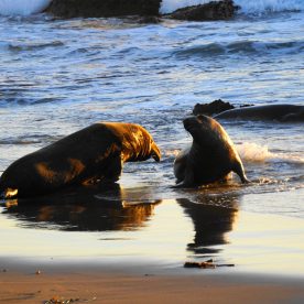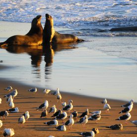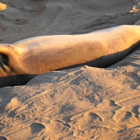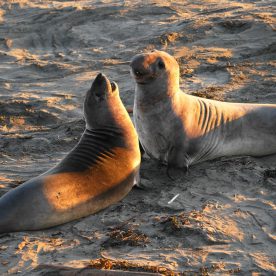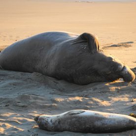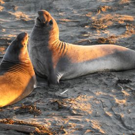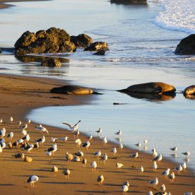 Elephant Seals haul out on beaches near San Simeon year round, as they go through different phases in their life cycle. In peak times, there are up to 17,000 animals on the San simeon shores. There are three peak times of the year that have large populations of seals – January, April, and October.