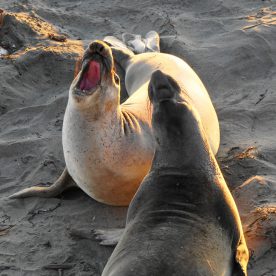 Starting in November, adult male elephant seals start to arrive on the shore. Adult males will stake claim to female pupping areas on the beach. When another adult male challenges a pupping location, a fight for dominance ensues. Adult males will fight for mating rights from December through January. Elephant seal bulls can reach 16 feet in length and weigh up to 5,000 pounds. Watching these enormous animals fight for dominance is quite a spectacle.