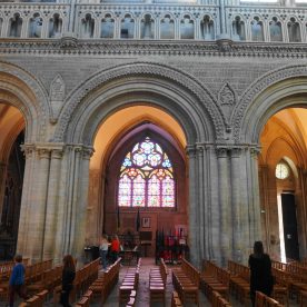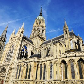 Bayeux Cathedral is a Norman-Romanesque style cathedral built originally in the 11th century. It was the original home of the Bayeux Tapestry and is a national monument of France. The site is an ancient one and was once occupied by Roman sanctuaries. The present cathedral was consecrated on 14 July 1077 in the presence of William, Duke of Normandy and King of England. It was here that William forced Harold Godwinson to take the oath, the breaking of which led to the Norman conquest of England.