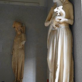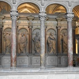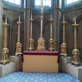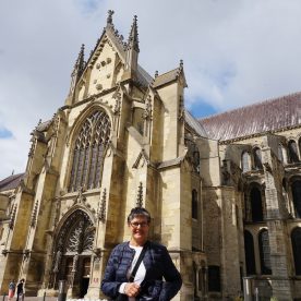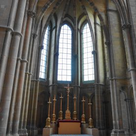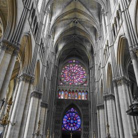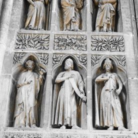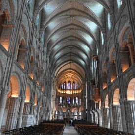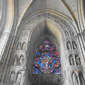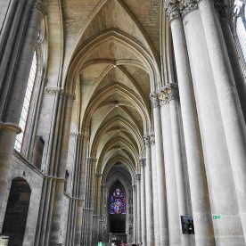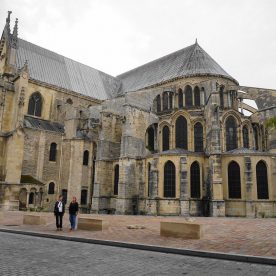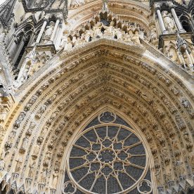 The cathedral church is thought to have been founded by the bishop Nicasius in the early 5th century. Clovis was baptized a Christian here by Saint Remigius, the bishop of Reims, about a century later. He was the first Frankish king to receive this sacrament. Construction of the present Reims Cathedral began in the 13th century and concluded in the 14th century. A prominent example of High Gothic architecture, it was built to replace an earlier church destroyed by fire in 1210. Although little damaged during the French Revolution, the present cathedral saw extensive restoration in the 19th century. It was severely damaged during World War I and the church was again restored in the 20th century.