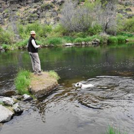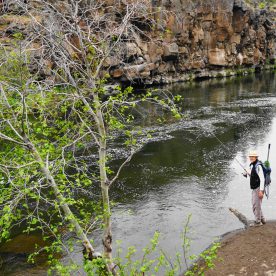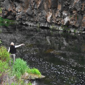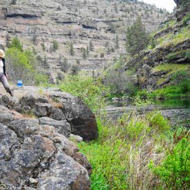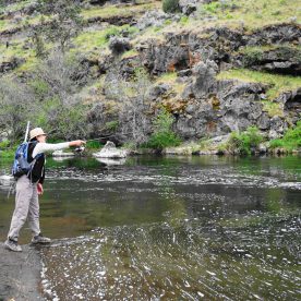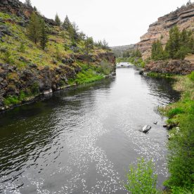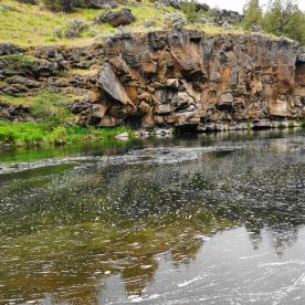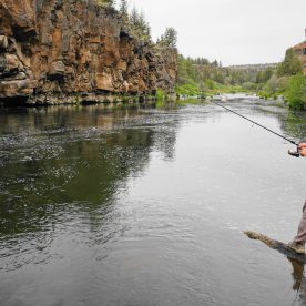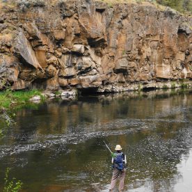 The river is world-renowned for its fly fishing. It is home to Columbia River redband trout (Oncorhynchus mykiss gairdneri) known locally as “redsides”. The redsides grow larger than most and also have a distinct darker red stripe than most wild rainbow trout. They are abundant in this stretch of the river, which has counts of 1,700 fish of 7 inches in size per mile (1,100 fish of 18 centimeters in size per kilometer) above Sherars Falls, and they are noticeably stronger than trout who do not have to cope with life in such a big, powerful river. The average catch for these fish is 8 to 15 inches (20 to 38 cm), and some are much larger. These redside or redband trouts are found throughout the river. Fishing for them is most popular from Warm Springs down to Macks Canyon (Warm Springs Reservation owns the entire Deschutes west bank from 16 miles (26 km) south of Maupin to Lake Billy Chinook and on up to Jefferson Creek on the Metolius River arm) below Pelton Dam. Fishing from Tribal lands requires special permits. From Pelton Dam to the mouth the Deschutes is one of America’s most productive trout waters and a top producer of summer steelhead, managed primarily for wild trout. This 100-mile (160 km) stretch of river drops 1,233 feet (376 m), carving a volcanic rock canyon 700 to 2,200 feet (213 to 671 m) deep.