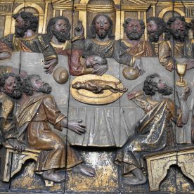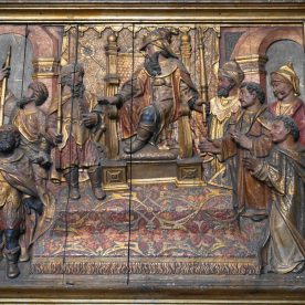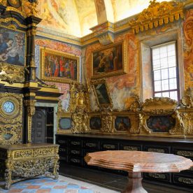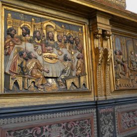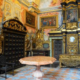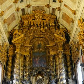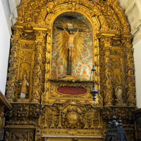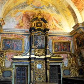 Inside, the large pillars make the nave seem narrow with a high ceiling. It has a restrained decoration with bare walls and only the high altar and some of its chapels are decorated in a Baroque style.