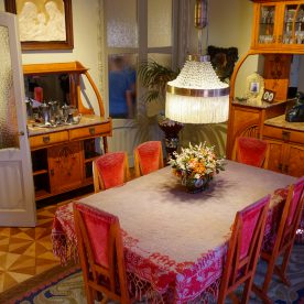 The apartments feature plastered ceilings with dynamic reliefs, handcrafted wooden doors, windows, and furniture, as well as hydraulic tiles and various ornamental elements.