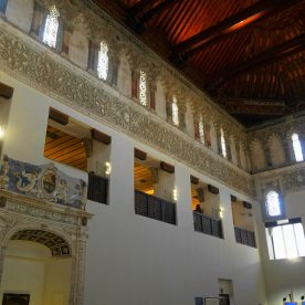 Right underneath the decorative wooden ceiling are ranks of colonnettes supporting poly-lobed arches that hug the wall, very similar to those at the Ibn Shoshan synagogue nearby. Below these are geometrically organized patterns of leaves, flowers, scallop shells, and interlacing tendrils, as well as the coat of arms of the Kingdom of Castile (a three-turreted castle). A wealth of Hebrew and Arabic inscriptions praise King Pedro, the building’s architect, Don Meir Abdeil, and the royal treasurer and patron of the synagogue, Samuel Halevi, who is described as “prince among the princes of the tribe of Levi.” Inscriptions also quote literary and religious texts, including the Bible and the Qur’an.