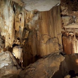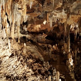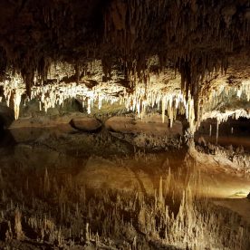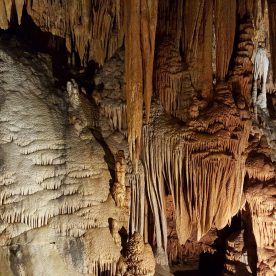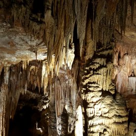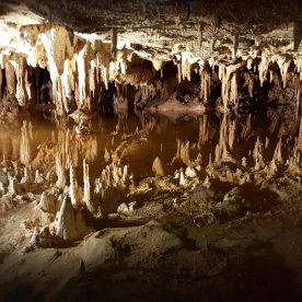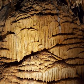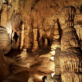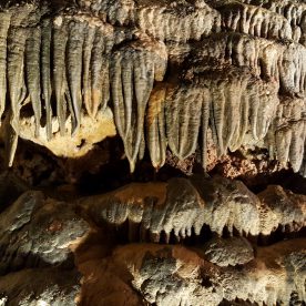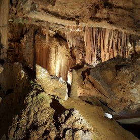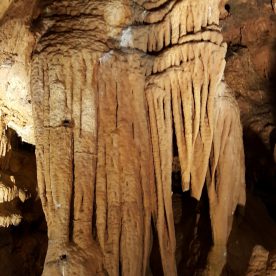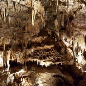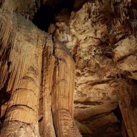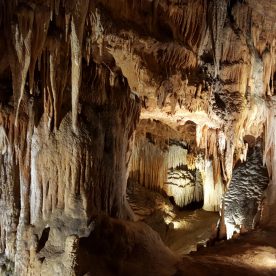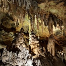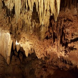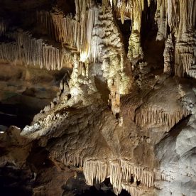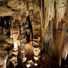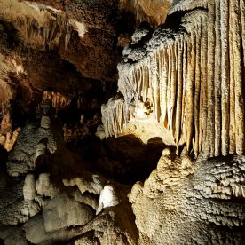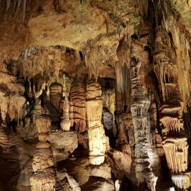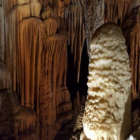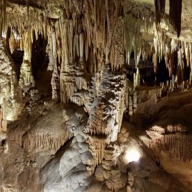 Luray Caverns was discovered on August 13, 1878 by five local men, including Andrew J. Campbell (a local tinsmith), his 13-year-old nephew Quint, and local photographer Benton Stebbins. Their attention had been attracted by a protruding limestone outcrop and by a nearby sinkhole noted to have cool air issuing from it. Seeking a cavern, the men started to dig and, about four hours later, a hole was created for the smallest men (Andrew and Quint) to squeeze through, slide down a rope and explore by candlelight. The first column they saw was named the Washington Column, in honor of the first United States President. Upon entering the area called Skeleton’s Gorge, bone fragments (among other artifacts) were found embedded in calcite. Other traces of previous human occupation included pieces of charcoal, flint, and human bone fragments embedded in stalagmite. A skeleton, thought to be that of a Native American girl, found in one of the chasms, was estimated, from the current rate of stalagmitic growth, to be not more than 500 years old. Her remains may have slipped into the caverns after her burial hole collapsed due to a sinkhole, although the real cause is unknown.