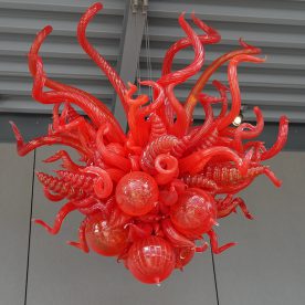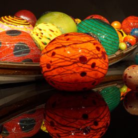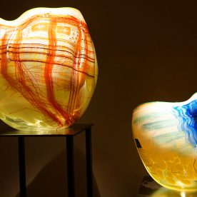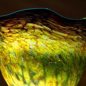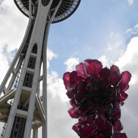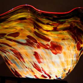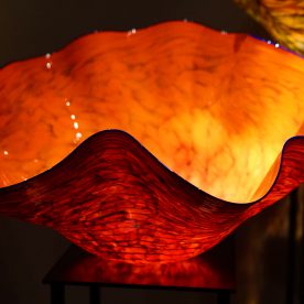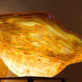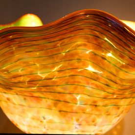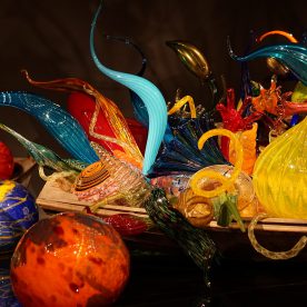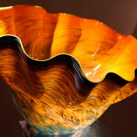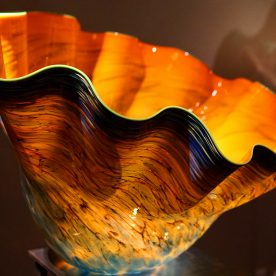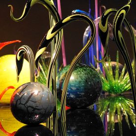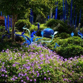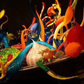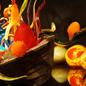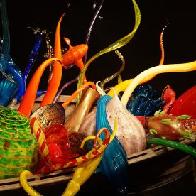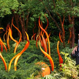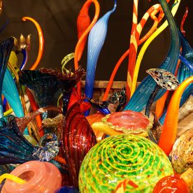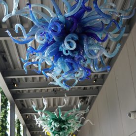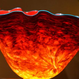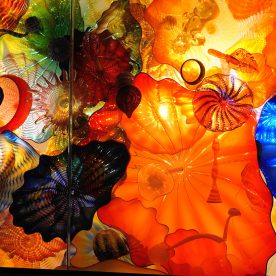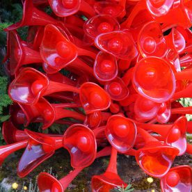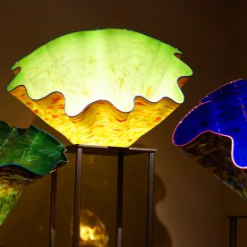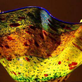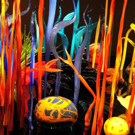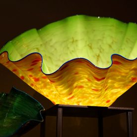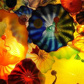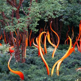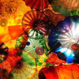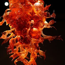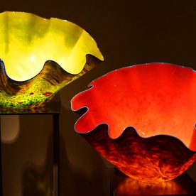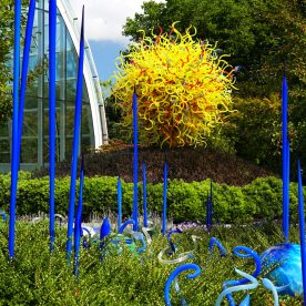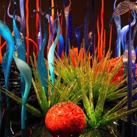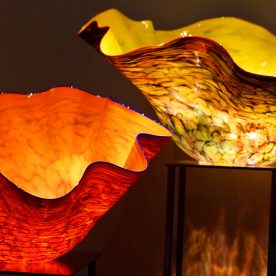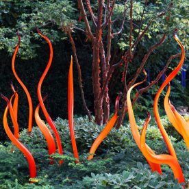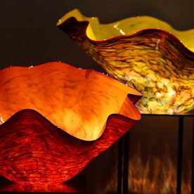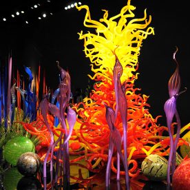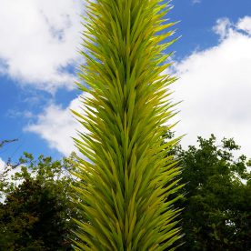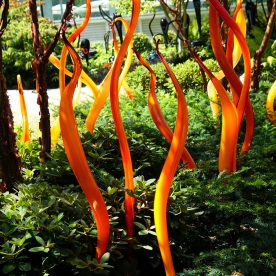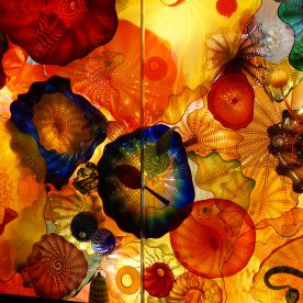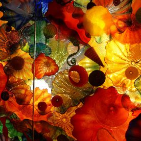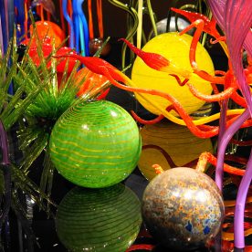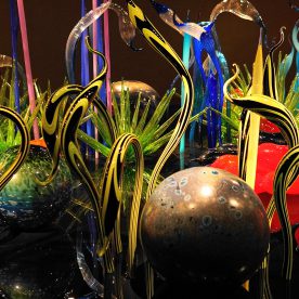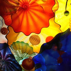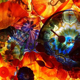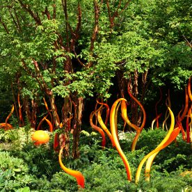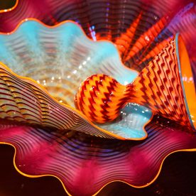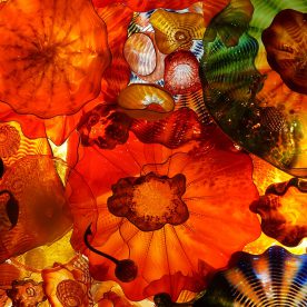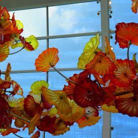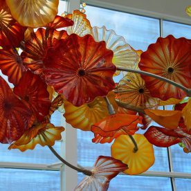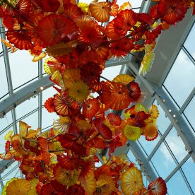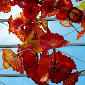 The centerpiece of Chihuly Garden and Glass is the Glasshouse. A 40-foot tall, glass and steel structure covering 4,500 square feet of light-filled space, the Glasshouse is the result of Chihuly’s lifelong appreciation for conservatories. The installation in the Glasshouse is an expansive 100-foot long sculpture in a color palette of reds, oranges, yellows and amber. Made of many individual elements, it is one of Chihuly’s largest suspended sculptures. The perception of the artwork varies greatly with natural light and as the day fades into night.