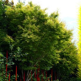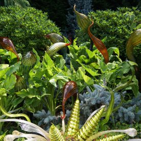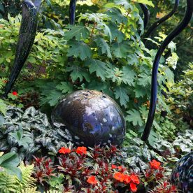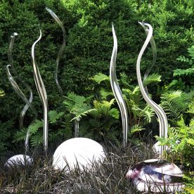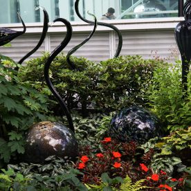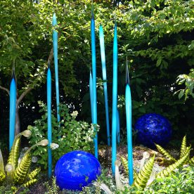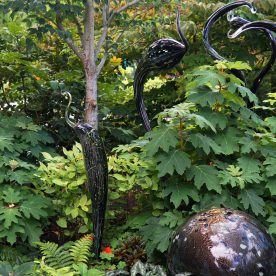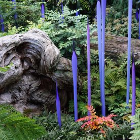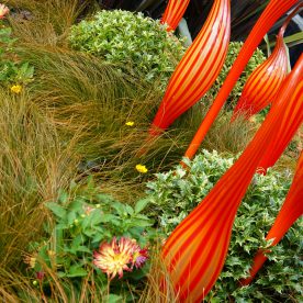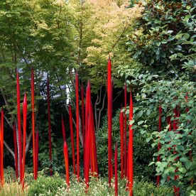 Anchored by four monumental sculptures, the exhibition Garden provides an opportunity for discovery and surprise. A rich backdrop for the art, it features paths lined with trees, plants and flowers. Crimson camellias, scarlet day lilies, dogwoods, hardy fuchsias and handkerchief trees provide the setting for the Crystal and Icicle Towers and an installation of Reeds on Logs. At the center of this lush landscape, on a bed of black mondo grass, is the Sun, an explosion of yellow and orange.