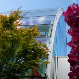 The project features three primary components: the Garden, the Glasshouse, and the Interior Exhibits, with significant secondary spaces including a 90-seat café with additional outdoor dining, a 50-seat multi-use theater and lecture space, retail and lobby spaces, and extensive public site enhancements beyond the Garden. The 100-foot-long installation inside of the Glasshouse is one of Chihuly’s largest suspended sculptures. Designed with the help of architect Owen Richards