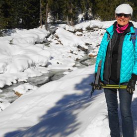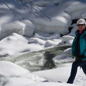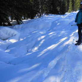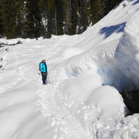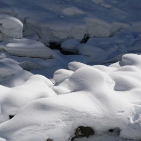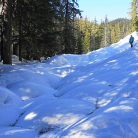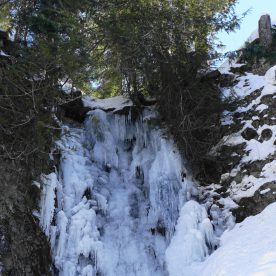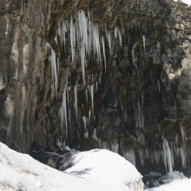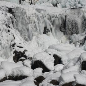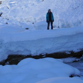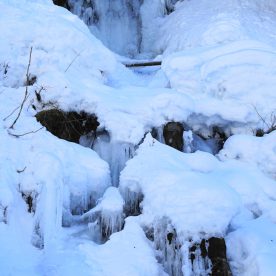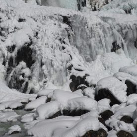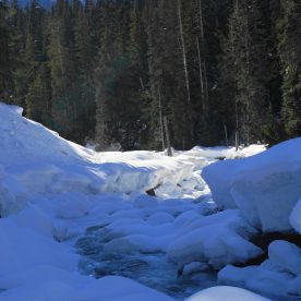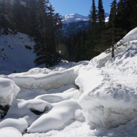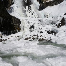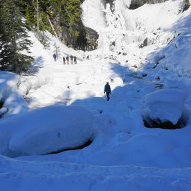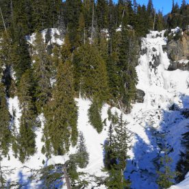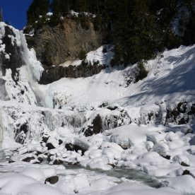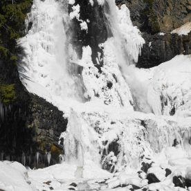 Finally we have a gorgeous weather and time on our hands to see the Beautiful British Columbia, Whistler area. Alexander Falls are just short drive from Whistler and located near 2010 Olympic Nordic Village. The waterfall usually drops an impressive 43 meters (141 feet) over three sections and is about 12 meters (40 feet) wide at its widest point, though in the winter snow and ice makes it a little bit smaller. The source of the water comes from Madelay Creek which is fed by several rivers and creeks in the Callaghan Valley region. The water fall could be observed from platform, but we found a path down to the base of the falls. Sun, snow, and absolutely stunning vistas made walk very pleasant.