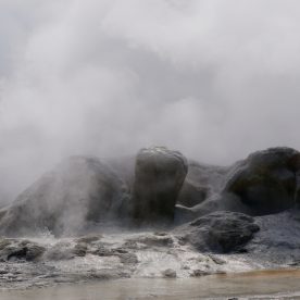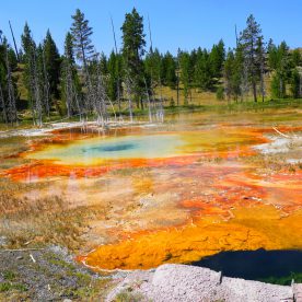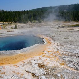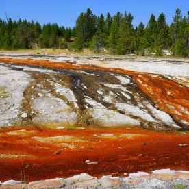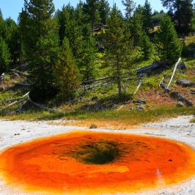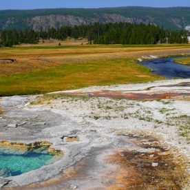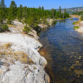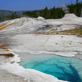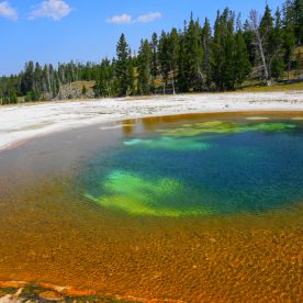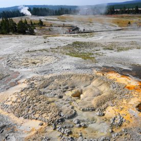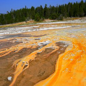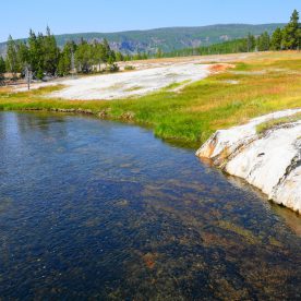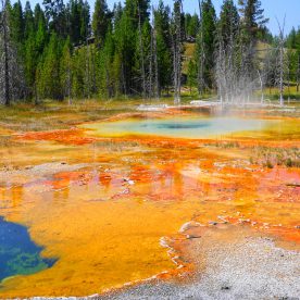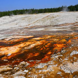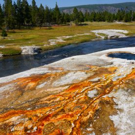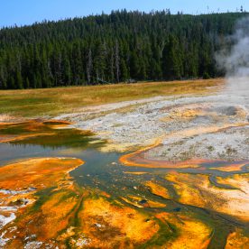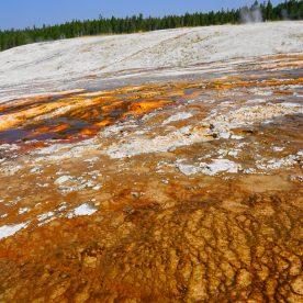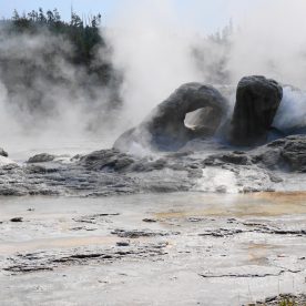 Upper Geyser Basin was our first stop- Yellowstone, as a whole, possesses close to 60 percent of the world’s geysers. The Upper Geyser Basin is home to the largest numbers of this fragile feature found in the park. Within one square mile there are at least 150 of these hydrothermal wonders. Of this remarkable number, only five major geysers are predicted regularly by the naturalist staff. They are Castle, Grand, Daisy, Riverside, and Old Faithful. “Old Faithful was named by the first official expedition to Yellowstone, the Washburn Expedition of 1870. They were impressed by its size and frequency. Old Faithful erupts every 35 to 120 minutes for 1 1/2 to 5 minutes. Its maximum height ranges from 90 to 184 feet. It is not the biggest or the most regular geyser in Yellowstone but it is the biggest regular geyser. Furthermore, it has been erupting in nearly the same fashion throughout the recorded history of the park. Through the years, it has become one of the most studied geysers. One result of this close observation is that the Park Rangers are able to predict its eruptions fairly accurately. This makes Old Faithful geyser one of the easiest geysers in Yellowstone to see”.